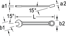 Aço Gedore-Vanadium. Acabamento niquelado e cromado. Chave combinada com um lado boca e outro Unit Drive com as mesmas medidas. A Unit Drive proporciona uma distribuição uniforme da força aplicada na parte central do sextavado, não havendo deformação dos cantos das porcas e parafusos. Inclinação em relação ao corpo: boca 15º e Unit Drive 15º. Parede fina.