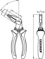 Corpo em aço Gedore-Vanadium e empunhadura em polímero anti-chamas nas cores azul e preto, padrão Gedore. Acabamento niquelado e cromado. Empunhadura ergonômica e antideslizante, com abas protetoras arredondas para maior conforto e segurança. Produzida por injeção, propiciando isolação até 1000 V, conforme norma NBR 9699, submetida à ensaios de: impacto, tensão elétrica, aderência, inflamabilidade e pressão/penetração. Utilizar este Alicate isolado, em tensão máxima de 1000 V em corrente alternada e 1500 V em corrente contínua, conforme norma NBR 9699. Atende com segurança a norma regulamentadora NR 10 - Segurança em Instalações e Serviços em Eletricidade, possui certificado de isolação. Tratamento térmico total e corte temperado por indução com dureza de 63 - 65 HRC. Alicate universal com cabeça angular em 60º, indicado para as demandas mais complexas em locais de difícil acesso. Permite utilização otimizada da força por longos períodos com apenas uma mão do operador, exigindo menor esforço e sem fadiga. Para cortar, puxar, segurar e dobrar fios. As mandíbulas planas e ovaladas permitem segurar com firmeza superfícies de forma chata, cilíndrica, oval, quadrada, sextavada, oitavada ou poligonal. Indicado para cortar todos os tipos de arame, inclusive corda de piano com diâmetro máximo de Ø 1,6 mm e com resistência à tração 2300 N/mm².