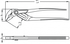 Aço Gedore-Vanadium e empunhadura ergonômica em polímero nas cores preto e azul padrão Gedore. Corpo com acabamento niquelado e cromado, cabeça retificada e fixador escurecido. Possui mordentes longos, curvos com dentes temperados por indução. Permite 15 posições de ajuste através de botão de regulagem. Alicate delgado indicado para utilização em locais de difícil acesso.