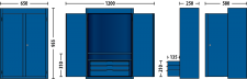 Em chapa reforçada de aço especial em espessura: 0,9 mm. Acabamento em pintura na cor azul padrão Gedore. Armário resistente e soldado. O 1400 é equipado com 3 gavetas internas, suportes e ganchos fixos para organização das ferramentas e fechadura central, com 2 cópias de chaves. É ideal para armazenar ferramentas utilizadas nas oficinas de manutenção de veículos, máquinas e outras aplicações. Armário possui dois furos com diâmetro de 16 mm, na parte de traz, para fixação na parede. Fornecido com ou sem ferramentas.