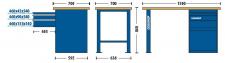 Módulo em chapa reforçada de aço especial com espessura: 1 mm, tampo em madeira de chapas compensadas multilâminas naval e suporte em chapas resistentes de aço especial no formato de U com espessura: 2 mm. Suporte e módulo com estrutura pintada na cor azul padrão Gedore, tampo com proteção em pintura stain. Excelente ferramenta para auxiliar na organização do posto de trabalho ou de oficinas. Possui grande superfície de trabalho em madeira, apoiada por um suporte e um módulo ref. 32830 (3 gavetas e 1 porta). O suporte é fixado no tampo de madeira com parafusos 5/16 UNF x 25 mm, por meio de buchas presas na sua parte inferior, que permitem montagem rápida e segura. O módulo é fixado da mesma forma, com os parafusos colocados por dentro da primeira gaveta e fixados nas buchas. Para melhor organização das gavetas, permite utilização de Divisória transversal pequena código: 007.555, Divisória transversal média código: 007.556, Divisória transversal grande código: 007.557 e Divisória com ponte código: 007.554, a serem adquiridas à parte.