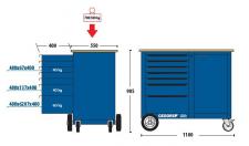 Carro bancada com estrutura em chapa reforçada de aço especial com espessura: 1 mm, com rodas e rodízios em núcleo de polímero e banda de borracha, tampo em madeira de chapas compensadas multilâminas naval. Estrutura, gavetas e porta com acabamento em pintura na cor azul padrão Gedore, e puxadores com acabamento em pintura na cor preta padrão Gedore. Bancada móvel com tampo em madeira e quatro rodas para deslocamentos rápidos, possui duas rodas fixas e duas giratórias, uma delas com freio para parada total. Preparado para receber o painel para ferramentas ref. R 1504 L a ser adquirido à parte, o carro bancada 1504 é equipado com 7 gavetas, fixadas por guias de rolamento de esfera, que garantem fácil movimentação. Para organizar melhor as ferramentas, as gavetas podem ser divididas por meio das divisórias que acompanham o produto. Ao lado, um amplo depósito com porta metálica propicia a segura disposição de ferramentas e outros acessórios mais volumosos. Possui fechadura central, com 2 cópias de chaves garantindo a segurança do material armazenado e organizando o posto de trabalho após o uso. Fornecido sem ferramentas. Para melhor organização das gavetas, permite utilização de Divisória transversal pequena código: 007.555, Divisória transversal média código: 007.556, Divisória transversal grande código: 007.557 e Divisória com ponte código: 007.554, a serem adquiridas à parte.