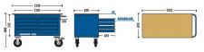 Corpo em chapa reforçada de aço especial com espessura: 0,9 mm, ancorada em estrutura Metalon com paredes de 1,5 mm, tampo em madeira de chapas compensadas multilâminas naval, com rodas e rodízios em núcleo de polímero e banda de borracha. Estrutura e gavetas com acabamento em pintura na cor azul padrão Gedore, puxadores com acabamento em pintura na cor preta padrão Gedore, tampo com proteção em pintura stain, fixação de rodas e rodízios com acabamento zincado / niquelado e cromado. Carro bancada soldado e resistente. Apresenta uma grande superfície de trabalho. As gavetas são acompanhadas de duas fechaduras centrais com 2 cópias de chaves cada, permitindo deslocamento seguro e garantindo a integridade do material armazenado. As portas guardam amplos depósitos, com prateleira em aço removível par facilitar a organização do espaço interno. O carro bancada possui 4 rodas grandes com rolamentos, sendo 2 fixas de baixo atrito e 2 giratórias (guia), com freios, para parada total e excelente estabilidade, que estão estrategicamente posicionadas, para evitar o tombamento do carro, mesmo com gavetas abertas. Acompanha puxador tubular em aço.