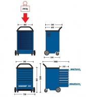 Estrutura em chapa reforçada de aço especial com espessura: 0,90 mm, com rodas e rodízios em núcleo de polímero e banda de borracha, alça e base de trabalho em polímero. Estrutura e gavetas com acabamento em pintura na cor azul padrão Gedore, puxadores com acabamento em pintura na cor preta padrão Gedore. Carro com grande capacidade de armazenamento para ferramentas, design moderno, detalhes inovadores e acessórios práticos, combinados com as características de segurança Gedore tornaram o Tanto um assistente indispensável na fábrica ou na oficina. O carro 3000 possui alça-guia ergonômica, plataforma de serviço moldada e rebaixada com repartições práticas. Para organizar melhor as ferramentas, o Tanto possui seis gavetas pequenas, que podem ser divididas por meio de divisórias que acompanham o produto, e uma gaveta grande projetada especialmente para armazenar peças ou ferramentas de médio porte. São de fácil manuseio, abertura total com guia de rolamento de esfera e possuem travamento individual, que protege contra a abertura involuntária, principalmente quando em movimento. O 3000 possui fechadura lateral, com duas cópias de chaves. As rodas traseiras são giratórias, sendo uma com freio. As dianteiras são grandes e firmes com rolamento, facilitando o transpor de obstáculos. Possui chassi largo e reforçado que permite movimentação segura e grande agilidade. Giro em torno de si e parada segura na posição de trabalho. A parte traseira do 3000 recebe uma chapa perfurada para a disposição de ferramentas, acessórios e outros componentes de trabalho. A fixação dessas ferramentas na chapa metálica é feita através de ganchos e suportes, comercializados separadamente, que são: Kit de ganchos e acessórios ref. 1504 HS, Gancho refs. 1500 H0 ao 1500 H3, 1401 H1 e 1401 H2, Suporte ref. VS 245 H. Acompanha kit puxador. Fornecido com e sem ferramentas.