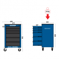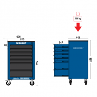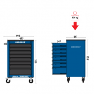 Estrutura robusta em chapa de aço especial reforçada, com espessura de 0,75 mm e construção soldada para maior estabilidade e durabilidade. Rodas e rodízios com núcleo de polímero e banda de borracha para movimentação suave. Base de trabalho em polímero para durabilidade e resistência, com ampla área de apoio e divisórias para organização. Rodas e rodízios posicionados estrategicamente para evitar tombamentos. Duas rodas fixas e duas giratórias, uma delas com freio. Gavetas na cor preta, opções de cores para a estrutura: azul padrão GEDORE, cinza e preto. Puxadores das gavetas com acabamento em pintura preta padrão GEDORE. Gavetas fixadas em trilhos telescópicos para fácil abertura e fechamento. Disponível em versões com 6; 7; 8 e 9 gavetas. Gavetas com sistema de fechamento por chave para segurança adicional.