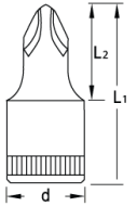 Aço Gedore-Vanadium. Soquete com acabamento niquelado e cromado, com ponteira escurecida. Para trabalhar com acessórios manuais com encaixe quadrado 6,35 mm (1/4”), conforme DIN 3120 - C 6.3, ISO 1174. Indicada para parafusos com perfil de encaixe tipo fenda cruzada "Phillips".