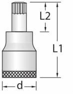Aço Gedore-Vanadium. Soquete com acabamento niquelado e cromado/ zincado, com ponteira escurecida. Para trabalhar com acessórios manuais com encaixe quadrado 12,7 mm (1/2”), conforme DIN 3120 - C 12.5, ISO 1174. Perfil dodecagonal externo, para parafusos especiais INBUS® XZN interno.