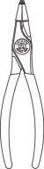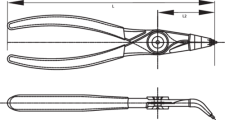 Corpo em aço Gedore-Vanadium e empunhadura plastificada na cor azul padrão Gedore. Acabamento escurecido. Alicate com pontas fixas e curvas 45º. Para anéis de segurança internos conforme norma DIN 472 e DIN 984.